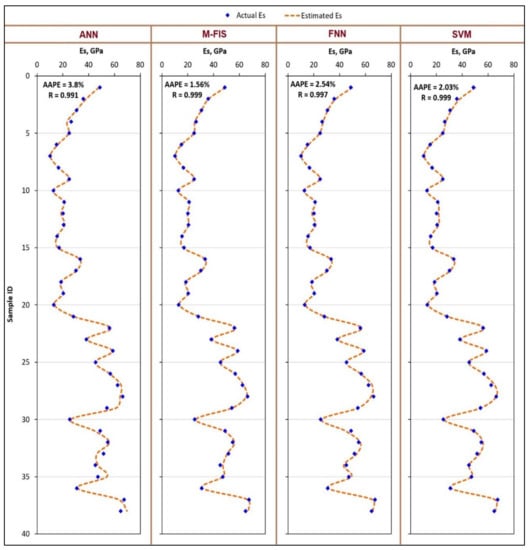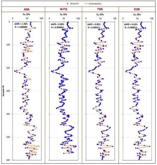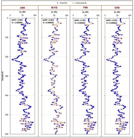 The performance of the developed machine learning models in evaluating the Estatic for the testing dataset, which was collected from the same training formation used to developed machine learning models (i.e., from Well-A), was evaluated. As indicated in Figure 6, all machine learning models predicted Estatic with very high accuracy. M-FIS predicted Estatic for the testing dataset with AAPE and R of 0.09% and 0.999992, respectively, FNN model predicted Estatic with AAPE of 0.85% and R of 0.999311, then SVM model which estimated Estatic with an AAPE and R of 0.62% and 0.999813, respectively, and the ANN estimated Estatic with AAPE of 1.46% and R of 1.000000. Visual check of the actual and estimated Estatic of the testing data set also confirmed the high accuracy of the machine learning models, as indicated by the good matching between the actual and estimated Estatic.