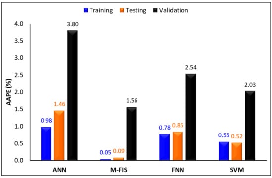 Comparison of the AAPE for the training, testing, and validation datasets for all machine learning models.