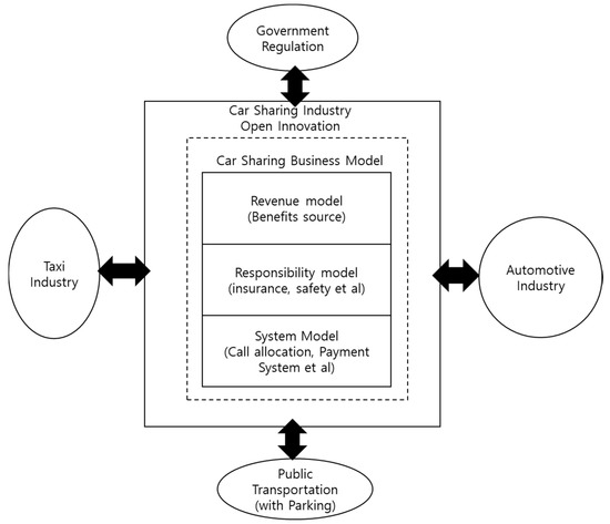 If you highlight this study, the difference in open innovation of car-sharing firms will lead to dynamic diversity of car-sharing business models, including revenue models, such as benefit source; responsibility models, such as insurance, safety; and system models, such as call allocation, payment system, etc. Business models have diverse factors, from nine-factor models to five-factor models, which have three factors in common: revenue model, responsibility model, and system model [49,50,51,52].