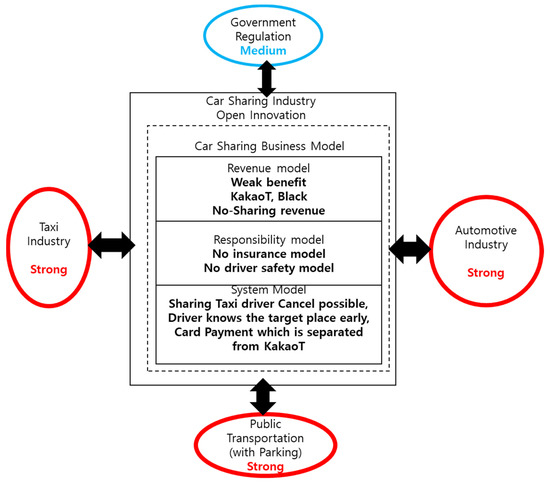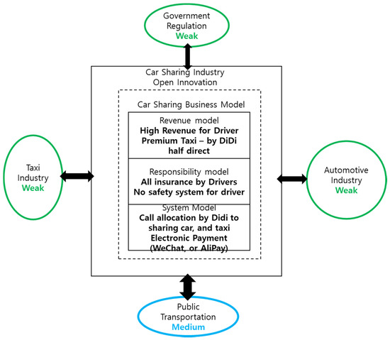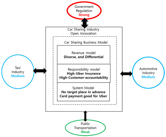 According to national strategy reports for 2025, open innovation is selected as a creative approach for the sharing economy in China. Government regulation structures often discourage such sharing economy innovations, reducing their popularity and slowing their development [45]. It should be noted that taxi drivers have cast Uber as an unsafe and rapacious competitor because it is a creative destruction actor at work, leading lawmakers to shut it out of various markets [46]. Many critics point out to consider who benefits from the sharing economy because the peer-to-peer economy or the gig economy does not benefit workers who are not working in the sharing industry but rather in the taxi industry or automotive industry [47]. However, the representative motivation of car-sharing such as lower carbon footprints has negative effects on the automotive industry because this industry will not grow in tandem as car-sharing is about economic self-interest rather than sharing and is predatory and exploitative [36]. In addition, competing industries or supporting industries of the car-sharing industry, such as public transportation, including buses and car parking systems, will have effects on the open innovation of car-sharing and the developing of business models of the car-sharing industry in addition to new regulations and customer protection from the non-balance of information, the vague distinction between private area and working area, and new social safety network requirements [12].