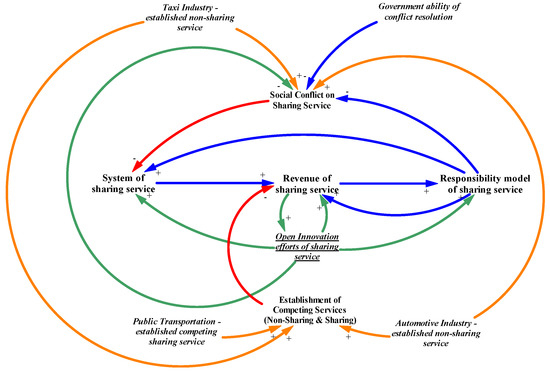 From this case study, we developed a causal loop model of the car-sharing industry in Figure 5. Car-sharing business models are diverse and different from each other according to the market potential, urban geographical conditions, and other industries such as the taxi industry, knowledge conditions including regulations, and so on, as illustrated in Figure 5, which is not linear but rather a dynamic system with diverse loops [56,57].