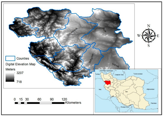 Kurdistan province is one of the 31 provinces of Iran, which is located in the west of the country, and its capital is the city of Sanandaj. Kurdistan province, with an area of 28,200 km2, is located between 34°44′ N to 36°30′ N latitude and 45°31′ E to 48°16′ E longitude. This area is 1.7% of the country’s total area and is ranked 16 in the country. According to the latest divisions in 2016 Kurdistan has 10 counties, 29 cities, 31 districts, 86 rural districts, and 1697 villages with inhabitants and 187 deserted villages. Counties of this province include Baneh, Bijar, Dehgolan, Diwandarreh, Sarvabad, Saqqez, Sanandaj, Qorveh, Kamyaran, and Marivan. Based on the 2016 population and housing census, the province has a population of about 1.6 million—71% urban and 29% are rural dwellers. The relative density of the population is 51.2 people per km2. The location map of the study area shown in Figure 1.