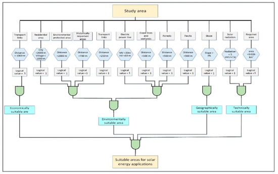 The main objective of the solar resource assessment is the evaluation of radiation values, as well as finding potential areas where solar power generation is possible with available technologies. In this case, according to the accuracy of the available data, narrowing the entire area to appropriate areas continues until the suitable areas are finally identified. The assessment process is based on a systematic survey process. At each step, less attractive areas are removed and the process continues on promising areas. Data and information management in the resource assessment process requires the integration and interpretation of results to identify suitable areas. A huge amount of technical and non-technical information is needed to identify suitable areas. The restrictive analytical method [40] is used to identify potentially suitable locations. In this regard, the study area can be divided into two parts based on the possibility and unfeasibility of applying solar technologies. The Boolean logic (restrictive) method uses pre-defined constraints (as shown in Figure 4) for identifying the suitable location for placing the solar technologies. Boolean logic uses a binary condition for input and checks a binary condition for the outputs. Logical math tools consider the value 0 for false conditions and the value of 1 for the true conditions. With respect to each criterion, the study area is divided into two discrete classes: 1 for areas with the possibility of constructing solar power plants, and the 0 for unfeasibility of the areas [41]. The main steps in the restrictive method are as follows: