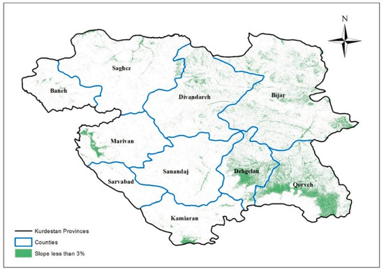 By applying economic and environmental constraints, suitable areas map for solar power plant construction will be as Figure 6. Province slope map was created using DEM maps. Geographically permissible area map (areas with slopes less than 3%) is shown in Figure 7. Finally, by applying the technical constraints, and the integration of four layers of suitable areas, in terms of technical, economic, environmental, and geographical constraints. Figure 8 is achieved as the final map of suitable areas for solar power plant applications. According to the map of Figure 8, it can be seen that an area of about 62 km2 is available in the province for the construction of solar power plants.