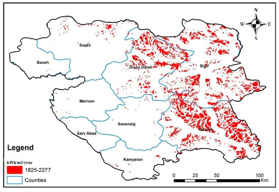 As mentioned, the available area will be for the use of both systems (not simultaneously); and so it cannot be represented total solar energy potential in general application. This will be possible by considering more scenarios, close to reality forecasts, and more detailed assessment. Therefore, solar potential map in these two general applications is presented separately for each application. The results of this section are shown in the map of Figure 10 as a potential use of solar water heater and Figure 11 shows domestic PV potential.