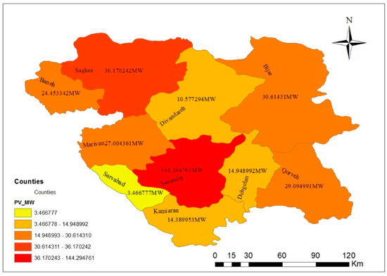 These systems will create a full-function only in designed conditions. According to the analysis conducted by NREL, the performance of these systems under various conditions is a coefficient of maximum power. These coefficients in different climatic conditions, and in various US states, have been presented in [47]. The capacity factor of 0.231 is considered for Kurdistan province 3030. Therefore, the power generated by the small PV power plant systems, in Kurdistan province is calculated from Equation (2), and with a capacity factor of (Z) 0.231, maximum power of 48 MW/km2, and an available area of 62.289 km2. By inserting these numbers in Equation (2), the evaluated power in the solar PV power plants application will be equal to 691 MW. This is the potential power of the solar PV power plants in Kurdistan province.