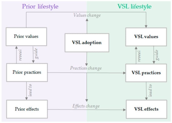 - VSL practices: A lifestyle is the assemblage of practices that give substance to the ongoing narrative, self-identity, and self-actualisation [,]. In other words, a unique set of practices determines one’s lifestyle [,]. Therefore, determining concrete VSL practices as well as the change of practices compared to the prior lifestyle is both essential to pinpoint the VSL [,,,].