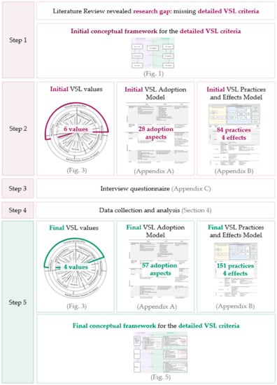 The results (Section 4) will describe each of the four aspects—values, adoption, practices, and effects—in detail and will also provide further knowledge on each aspect from existing literature. We will then consolidate all significant aspects into the initial conceptual framework of Figure 1 resulting in the final conceptual framework for detailed VSL criteria, which this study proposes. In doing so we will address the identified research gap. The research method is discussed next.