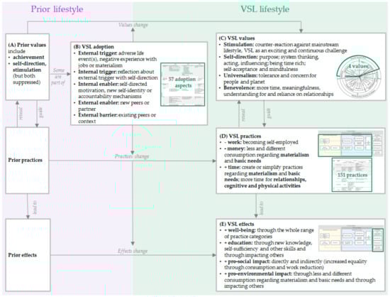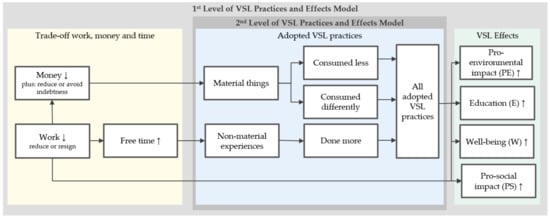The decrease of available money affects the consumption of material things, which are either consumed less [] or differently [] (blue box, Figure 4). On the contrary, the increase of available free time positively affects non-material pursuits or practices that do not require material consumption [,]. Through reduced or different consumption in combination with more non-material experiences, a new set of practices emerges, which signifies a unique VSL of the individual.