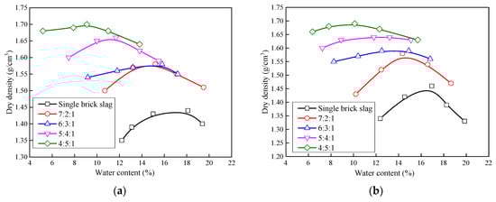 According to the Transportation Industry (JTG) E40–2007 [39], the dense-graded mixture is compacted in three layers. After compaction, the sample has an inner diameter of 15.2 cm, a height of 12 cm, and a volume of 2177 cm3. Figure 2 shows the relationship between water content and dry density; the optimum moisture content and maximum dry density of different ratios can be obtained, as shown in Table 3. Brick slag has low density and a high water absorption—as the content of brick slag increases, the optimum moisture content increases and maximum dry density decreases.