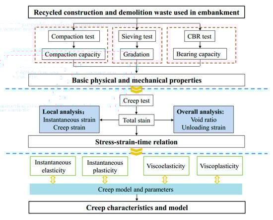 Embankment deformation usually lasts for several years, however, the tests under natural conditions are carried out for about 60 days. Considering that the creep mechanism of the samples’ under saturated conditions is complex and the time to reach stability is long, we conducted continuous observations to further understand the creep characteristics, which lasted for about 700 days; then, the samples were unloaded to analyze the deformation characteristics of the CDW filler. The overall conceptual framework is shown in Figure 5 below.