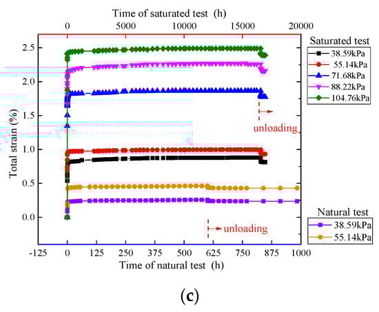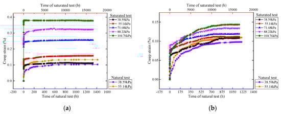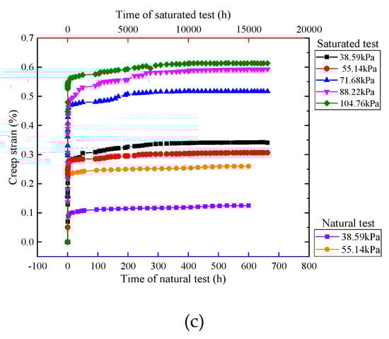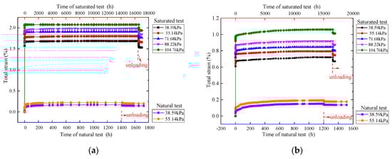 The stress–strain curves and unloading curves of the samples under natural conditions and saturated conditions are plotted on a graph—the top axis represents the test time under saturated conditions, and the bottom axis represents the test under natural conditions, which can better compare the regeneration under different conditions, as shown in Figure 6. It can be seen that the creep strain of the CDW filler under test stress tends to be stable with time, which belongs to stable creep, and total deformation can be divided into instantaneous deformation and creep deformation. It can be seen from Figure 6 that under the first level and the second level load, the creep strain under saturated conditions is much larger than that under natural conditions. Water has a significant impact on the deformation of recycled CDW filler.