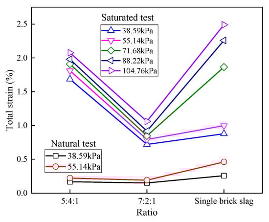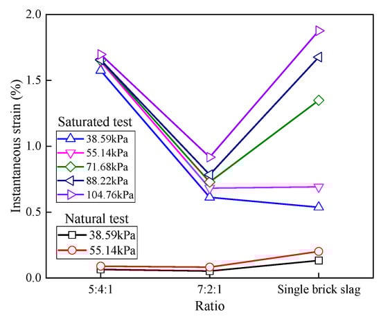 When the load is applied to the compacted specimen, the equilibrium state between the particles is broken and the instantaneous deformation occurs due to the fragmentation, slippage and rearrangement of the recycled particles. Figure 10 shows the relationship between instantaneous strain and ratio. Under the same load, the instantaneous strain of the samples under natural conditions is much smaller than the samples under saturated conditions, as water greatly accelerates the rate of slippage and the filling of particles, and the instantaneous strains of the two conditions differ greatly. The larger the load, the greater the instantaneous strain of the sample. The instantaneous strain of the different ratios is also quite different; under the same load, the instantaneous strain of the samples with a 7:2:1 ratio is almost the smallest, and the single brick slag differs greatly under different conditions and loads, as brick slag has a low strength and is easily broken, and the deformation is unstable without the support skeleton. Compared with Figure 6, it can be seen that the instantaneous strain accounts for 65%–95% of the total strain. In order to reduce the settlement of the embankment, the compactness during construction should be strictly checked.