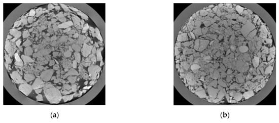 Figure 7 shows the relationship between total strain and ratio. It can be seen that, under the same load, the total strain of the samples with a 7:2:1 ratio is the smallest, the total strain of the single brick slag is the largest, and the strain of the sample with a 5:4:1 ratio is between the two. The strength of the mortar is low, but the proportion of mortar slag is small, so the effect on deformation is small. Therefore, the main consideration is the influence of brick slag and concrete slag; the brick slag has low strength, and the particles will break, compact, rotate, and slide after being loaded. The concrete has high strength and hardly breaks under the same load, the concrete slag acts as the skeleton in the mixture. Furthermore, Li et al. used a CT scan to observe the internal microstructure of the mixture [41,42], the image scanned by CT is a grayscale image, and the black parts indicate the pores of the sample, as shown in Figure 8. For the recycled aggregate used in this paper, the concrete slag has a high strength and acts as a skeleton in the mixture, while the brick slag and the mortar slag are easily broken, and the broken parts fill the gap between the concrete skeletons.
