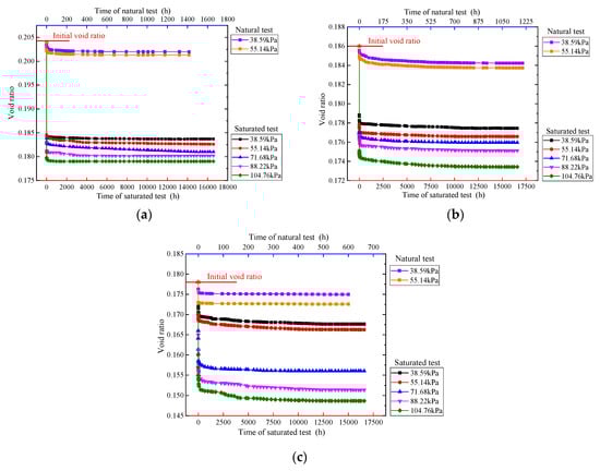 Figure 9 shows the relationship between the time and void ratio of the creep test, the top axis represents the time under a natural test, and the bottom axis represents the time under a saturated test. As time goes on, the void ratio of samples gradually decreases, that is, samples gradually become dense. The void ratio of the saturated samples varies sharply in the earlier period—water not only softens the particles, but also reduces the friction between the particles, ultimately promoting the rearrangement of the particles. In general, as the brick slag content increases, the final void ratio of samples gradually decreases. The brick slag content of samples with a 5:4:1 ratio is small; brick slag cannot fill in the concrete skeleton well, and the void ratio is large, but the concrete strength is high, so skeleton is not easily broken and the void ratio changes are relatively small. Brick slag is sensitive to changes in load, as the load increases, the brick slag breaks and the sample is compacted.