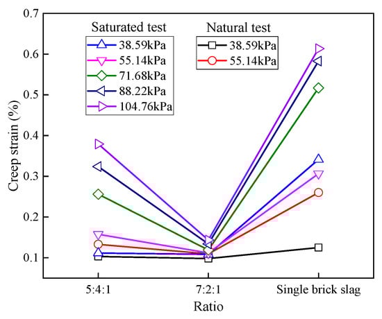 Figure 12 shows the relationship between creep strain and ratio. Under the same load, the creep strain of the samples with a 7:2:1 ratio is the smallest and the single brick slag is the largest. In the instantaneous deformation stage, most of the deformation has occurred, and the samples are in a relatively balanced state; the creep deformation is mainly in the small range of slippage and dislocation of particles. Based on the original balance, the particles are slightly adjusted. The relative position of the particles in the sample with a 7:2:1 ratio is stable, the scope of further adjustment is small, and the creep strain is also the smallest. The strength of brick slag is low, the sample with a 5:4:1 ratio has more pores. Overall, the creep strain of the recycled CDW sample accounts for about 5%–35% of the total strain, which varies according to the ratio, load and water environment. For the embankment filled with recycled CDW filler, the post-construction settlement cannot be ignored.