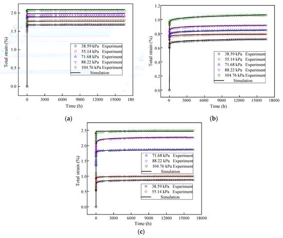 Fitting results of the improved Burgers model: (a) 5:4:1 ratio; (b) 7:2:1 ratio; (c) single brick slag.