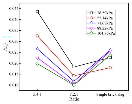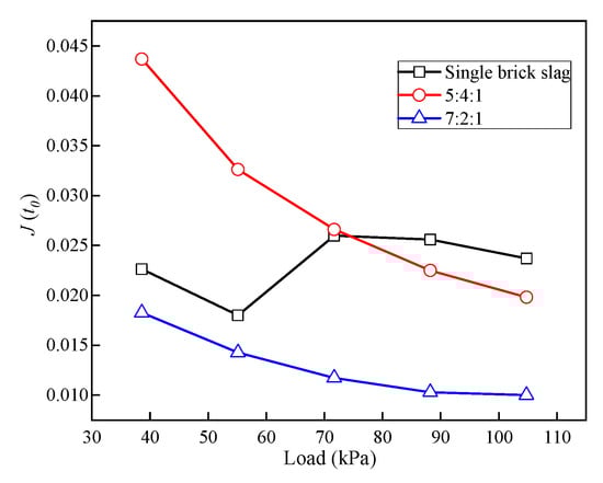 The load applied in this paper simulates the axial load at the different depths of the embankment. Figure 18 shows the relationship between the equivalent creep compliance and the load. The of the samples with 5:4:1 and 7:2:1 ratios decreases with the load. When the load is large, the rate of slippage, rotation and fragmentation of the particles increases and the time of the deformation stabilization decreases. As a result, the creep effects weaken as the load increases, that is, the deeper the filler is buried, the weaker the creep effects are. Under the same load increment, the value of the sample with a 5:4:1 ratio decreases at nearly the same rate, while that of the sample with a 7:2:1 ratio changes greatly. The content of brick slag in the 7:2:1 ratio sample is higher, and the brick slag is easily broken when the load is large. Although the deformation of the 7:2:1 ratio sample is small, the creep effect is greatly affected by the load. The value of single brick slag decreases with the load at the first, but a sudden change occurs when the load is 55 kPa. There is no concrete slag acting as skeleton, the structure of single brick slag is gradually destroyed with the increase in load, that is, if the filler is single brick slag, the fillers below the middle of the embankment are destroyed.