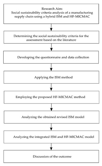 A unique combined method of well-recognized ISM and a novel HF-MICMAC is applied in constructing the social sustainability criteria interrelations evaluation. The HF-MICMAC is the MICMAC method combined with HFS theory. By obtaining the driving and dependence powers, four clusters of social sustainability criteria can be revealed. The driving power indicates the extent to which each criterion impacts others and the dependence power is the degree that each criterion is influenced by other criteria. In the proposed HF-MICMAC method, we introduce a new diagram titled impact digraph map (IDM) (Section 3.3. step 7) as well as the integrated ISM and HF-MICMAC model. The overall research methodology flowchart of the study can be found in Figure 1.
