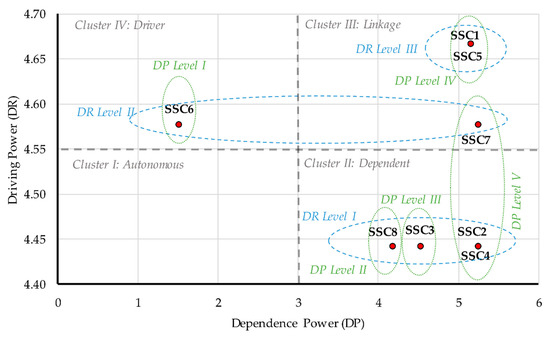 The DR in HF-MICMAC is computed by summing the entries in the rows and the DP is derived by adding the values in the columns together. The driver-dependence diagram can be depicted while the horizontal axis is driven or DP power and the vertical axis is DR or influence power [63]. The DR indicates the extent to which the risk impacts others and DP is the degree that the risk is influenced by others. The diagram categorizes the area into four clusters as follows: