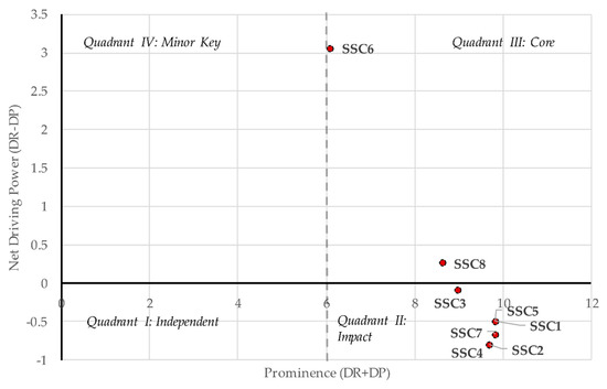 Third, work safety, and labor health (SSC1) together with interests and rights of employees (SSC5) are recognized equally important, and both are identified as linkages in the driver-dependence diagram. Due to their strong driving and dependence scores, any action to improve these areas has a corresponding effect on other areas. Interests and rights of employees (SSC5) is more concerned with employee matters than structured managerial processes. For instance, interests and rights of employees (SSC5) are more about to what extent employees are free at work to express their innovative ideas to address sustainability issues in the organization. If work safety and labor health (SSC1) is met with acceptable standards, then we can expect the path through social sustainability would be even more stable.