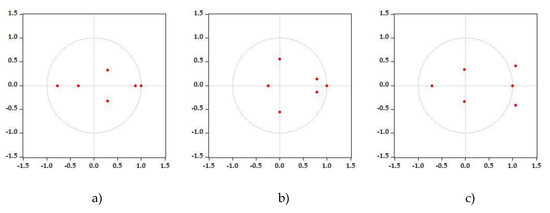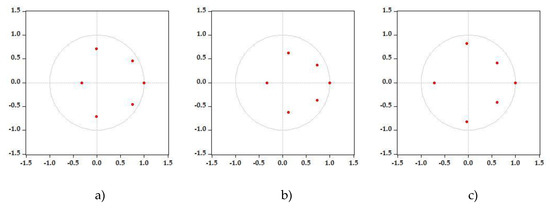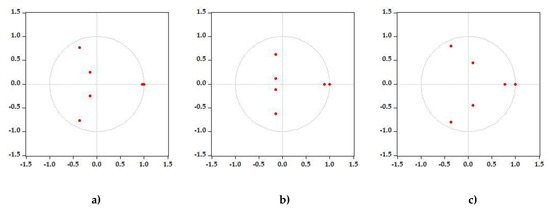 For these reasons, Figure 3, Figure 4, Figure 5 and Figure 6 show the stability of the parameters of the built VAR by analyzing them through the inverse roots of the characteristic AR (AutoRegressive) polynomial displayed in an Argand Diagram (or Argand Plane, see, e.g., [80]). According to this procedure, all of the points included in the circle determine a stable model. In this sense, all of the elaborated VAR models can be considered stable, with the exception of c) in the UMI and LI countries (Figure 4c and Figure 6c).
