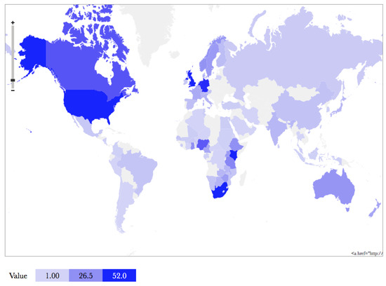 Schematic heat map of authors’ institutions’ country location shown in a standard Mercator projection to ease interpretation and country identification. The darker the blue, the greater number of authors registered as part of an institution in that country.