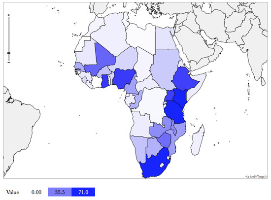 Since citations can deal with research across multiple countries the total can be above the number of papers overall. In total 1217 references to African countries were found, only across 50 African countries with eight not mentioned at all. The most significant country with no mentions was the Ivory Coast (Cote d’Ivoire), followed by Western Sahara. The remainder were small island states. As with the authorship bias towards South Africa, a significant majority of GIGGA research is South Africa focused. Out of all the countries in Africa, South Africa featured in 382 citations (40% of the total). This is equivalent to all the citations featuring the next six most commonly mentioned African countries (Kenya, Tanzania, Ghana, Nigeria, Ethiopia and Uganda) and 20 more than the bottom 50 African countries combined. Twenty-seven African countries featured in less than 1% of the citations. Figure 3 graphically illustrates the patchy distribution of study focus. Note that the difference between South Africa and the next nearest countries is not effectively represented in this figure.