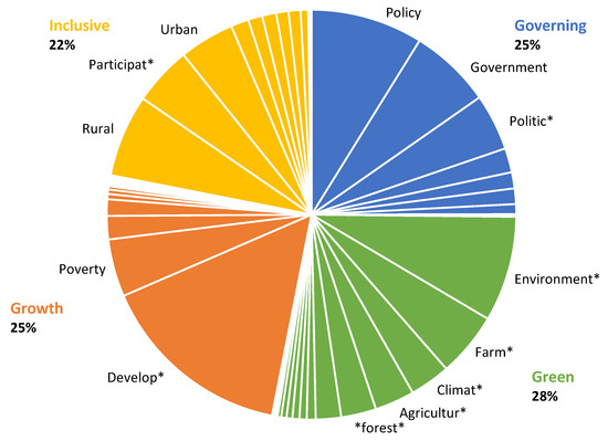 Across all the 55 GIGG search terms, 5339 hits were recorded—that is, the sum overall for the number of citations each term was found in. To this, Governing contributed the least (1249, 24%) and Green the most (1499, 28%). This distribution is graphically charted in Figure 4. However, as noted above Governing has half the number of terms compared with Green. If we take just the top four terms that recorded the highest number of hits for each GIGG element, thereby mitigating the effect of number of search terms, we find almost the reverse picture. Here Growth comes out on top with 1190 hits, Governing second with 1119 hits and Green third with 1022 hits.