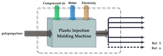 The model proposed below is applied to a case of an energy baseline for multiple production steps, using a single raw material fed to a plastic injection machine. A plastic injection machine produces multiple products in a period of time and varies according to the requirements of the program. Figure 5 shows the process diagram.
