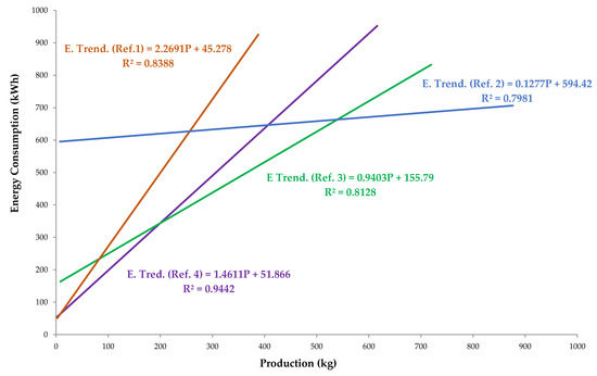 Figure 6 shows the energy baselines of the most significant references, in other words, those that are most often manufactured on the machine. The efficiency of this equipment varies from to , depending on the type of product manufactured.
