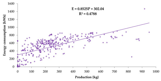The energy consumption records of the equipment, and the daily reference production, are used to estimate the Energy Baseline equation as Equation (5):