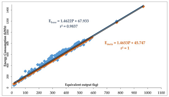 Finally, in Figure 8, the energy baseline is estimated again. It shows an increase in the correlation coefficient of 51%, compared to the initially estimated values. The new correlation coefficient indicates a strong correlation between the variables, therefore, the normalized energy baseline is suitable.
