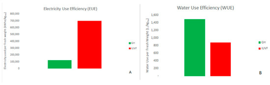 IUVF facilities use their resources more efficiently than GHs. Water use efficiency (WUE) in closed systems (as in IUVF) provides higher efficiency in comparison to semi-open production systems (Figure 2) [42].
