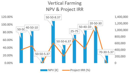 For Scenario 6 (which has an equity of 25%, a bank loan of 75%, and an interest rate of 6.25%), the results are even better (an IRR of 63.3%) with a three-year payback period. Lastly, in cases where supplementary funding is found (e.g., crowdsourcing or possible state subsidy), the cash flow analysis results show that the business is extremely profitable with a NPV value above 1 million €, an IRR of 97.5%, and a two-year payback period. Figure 3 comparatively illustrates the results of NPV and IRR of different funding scenarios of indoor urban vertical farms (IUVFs).