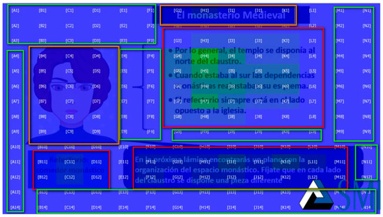 Regarding data preparation for the scan-path analysis, the fixations of the ocular scanning were first of all extracted. The fixation time was set at an interval of 83.1–1033.2 ms and a maximum radius of 100 pixels. The data were then transformed into data chains, and each page of the video presentation was divided up into small areas. In this case, fourteen horizontal and vertical partitions were prepared with a screen resolution of 1680 × 1050. The eye-tracking software facilitated the assignation of an alpha-numeric code in each area. An example of the spatial division of the task in the video can be examined in Figure 3. The AOIs can also be observed (Relevant area in red; Non-relevant area in green; Barely relevant area in orange). The Relevant information referred to text and image data that had been presented in the video and mentioned in the voice-over; the Non-relevant areas were spaces in white; and the Barely relevant areas referred to elements such as the avatar image or the title. A total of 36 scan-paths were analyzed by applying different string-edit methods (Uniform Distance model, City Block Distance model, and Euclidian Distance model).