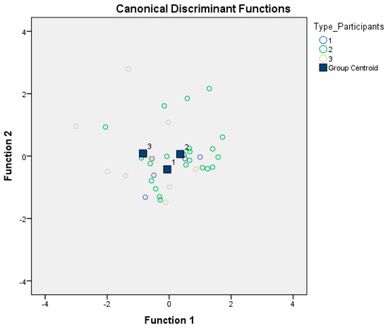 A discriminant analysis of the variable “type of cluster” was then performed to see the distribution of participants assigned to each group. No significant differences were found for Wilks’ Lambda in the dependent variables, and a tendency towards the difference was only found for the variable “Crossword solving” (p = 0.06) (see Table 8). In Figure 4, the distribution of the participants can be seen in each of the clusters that were found.