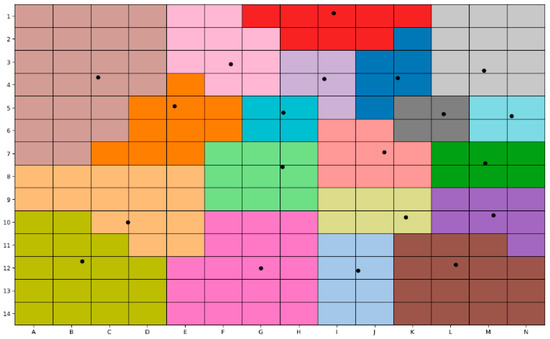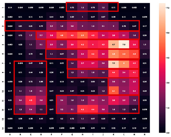 The frequencies of the fixations on the scan-path chains completed by the different participants within the defined quadrants were found. As seen in Figure 5, the greater percentages of fixation frequencies were situated within the AOIs defined as relevant (noted in red). A clustering analysis with k-means was also performed on the fixation frequencies on the AOIs, where the points represent the clusters within the AOIs (see Figure 6).