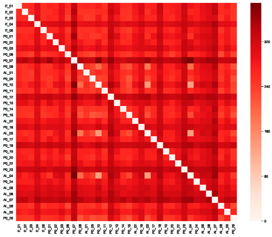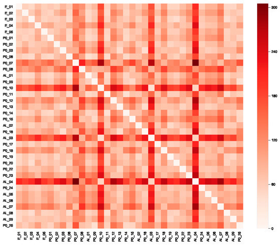 The following test was to establish whether there were significant differences between the distances found with the three methods by applying a single-factor fixed-effects ANOVA (type of method). Significant differences were found both for the Uniform Distance model (F1, 34 = 13006.22, p = 0.007) and for the City Block Distance model (F1, 34 = 771.23, p = 0.043), the former model showing higher significance for discrimination of distances. In Figure 7, Figure 8 and Figure 9, the distances between each pair found with each model are shown. The most clearly defined trajectory is the one found with the Uniform Distance model (a darker red color implies that the distance was greater between the participants (with a confidence interval of 95%).