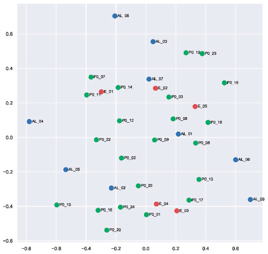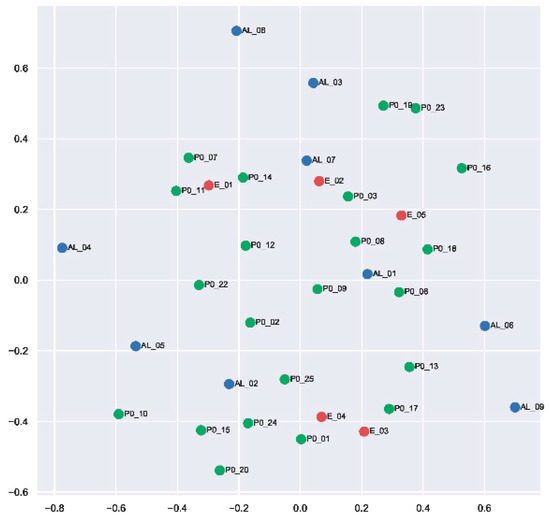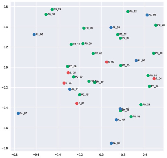 Subsequently, multi-dimensional scaling [38] was performed with the distance models that were used to test the distribution of the distances that were obtained. As may be seen, the uniform Distance model is where a sharper grouping of the distances between the chains was observed between the chains developed by the participants where the extreme cases were the most clearly discriminated (see Figure 10, Figure 11 and Figure 12).