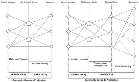 Economic growth necessitates flexible transportation to ease access to resources and trade markets []. Transportation is the main concept for promoting social intelligence approaches and economic development []. Urban freight transport (UFT) has been defined as a process and a system to collect, transport, and distribute goods within urban areas. Although urban freight activities have continually contributed to the economic growth of cities, they have caused the majority of environmental externalities within urban areas. These negative externalities primarily consist of air pollution, congestion, noise, etc. [,]. Therefore, considerable research has focused on promoting sustainable urban freight transport (SUFT), which is commonly based on the conventional urban freight network. The dimensions of sustainability primarily include economic (e.g., economic performance), environmental (e.g., emissions, transport), and social aspects (e.g., public policy, customer privacy) []. A conventional urban freight network generally consists of two types: single-tier and two-tier (as depicted by Figure 1). The former system is commonly used in small or medium-sized cities, and the two-tier system is more suitable for large/megacities [,]. However, city development has brought challenges to the conventional network structure of UFT, particularly for large/megacities around the world. For example, urban population growth has increased the commodity demands and freight flows, and urban sprawl has increased the delivery range. It is noted that considerable research has paid little attention to the connections between freight transport and urban development []. This result reveals that the research on SUFT lacks systematic consideration of city development from a long-term view. Indeed, an urban freight transport strategy should be embedded in an overall sustainable development strategy with a long-term perspective (approximately 20–30 years) []. Therefore, it is critical to the comprehensive consideration of city development and sustainable urban freight planning from a long-term view.
