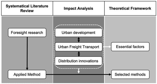 To answer the above research questions, we followed the research methodology design depicted in Figure 2. First, we used the SLR approach to determine articles involving foresight research published in the period of 2003–1018 on Scopus. The intention of this step was to understand the state-of-the-art of foresight research and determine the research methods used in the articles. Subsequently, the impacts of both urban development and distribution innovations on urban freight transport were assessed. Following this analysis, we selected the appropriate research methods for the long-term planning of SUFT. Finally, the theoretical research framework was proposed on the basis of the previous steps.