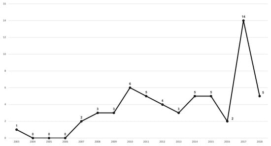 As presented in Figure 3, the peak in the number of papers was in 2017 when 14 articles covered foresight research on the distinct academic field. Despite the fluctuation in 2018, it is possible to appreciate the stable increase in the contributions related to foresight research in the last sixteen years. Of these 58 articles, eleven papers were published in the journal Foresight.