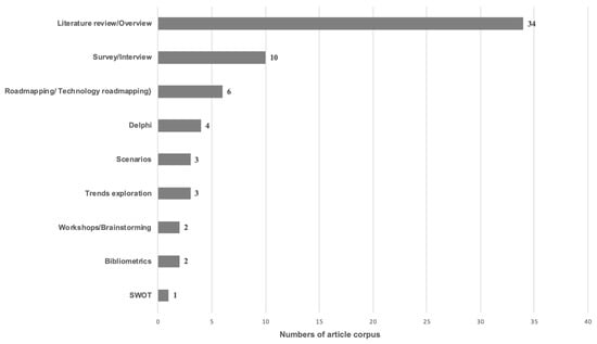The resulting classification of the article corpus is reported in Figure 5, where each paper can employ more than one research method. As expected, the literature review/overview is the primary applied methodology in the article corpus. Only one paper adopted a SWOT analysis. In these papers, the maximum number of methods per paper is two. For example, the research of Fiorini and Lin (2015) [] employed the literature review/overview and scenario approaches; Lee et al. (2008) [] adopted the methods of literature review/overview and trend exploration. This finding implies that a mixture of methods is used as a general approach in foresight research. Thus, the applied methods in the article corpus need to be further classified and analyzed.