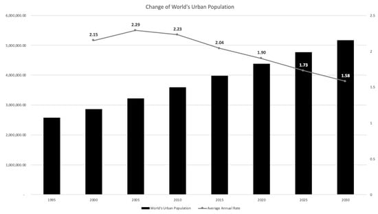 - United Nations. 2018 Revision of World Urbanization Prospects; United Nations: New York, NY, USA, 2018. [Google Scholar]