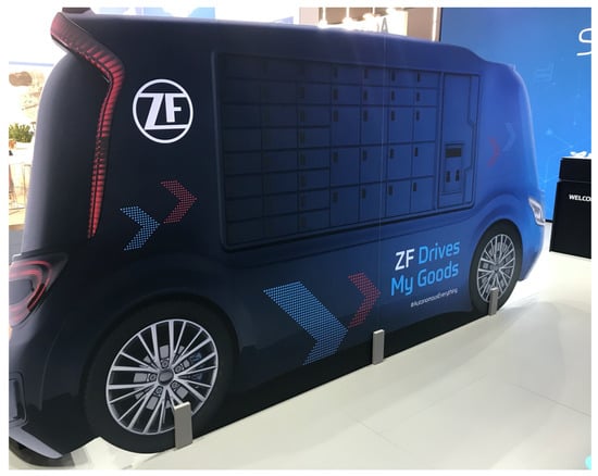 Moreover, future trends of applied urban distribution innovations use an integrated approach to compose emerging operational strategies [], such as the concept of “sustainable inner-urban intermodal transportation” [] and the “city logistics hubs” launched by DHL (Germany). Given that multiple distribution innovations will presumably be used in the future urban freight system, the selection of these innovations and their combination is also an investigated topic in the foresight research on urban logistics. It is noted that this topic is also a multi-dimensional and non-quantifiable issue. Besides the operational integration of urban distribution innovations, considerable technology enterprises have launched several specific projects to develop emerging transport mobility. An example is the ZF Friedrichshafen AG (Germany) proposal of the Autonomous Depot, which is a robotic vehicle equipped with parcel lockers (as depicted in Figure 9). From the view of technology companies, integrated technologies of various distribution innovations are able to develop brand-new transport modes for future city logistics. Forecasting the possible future transport modes is also a crucial component for the long-term planning of sustainable urban freight transport. Because the application of different transport modes has influenced the freight network structure, the prediction of future technologies contributes to the design of a flexible network structure from a long-term view, which thereby further promotes sustainability. These findings, as discussed previously, highlight that the morphological analysis method is an efficient solution for foresight research on future urban logistics.