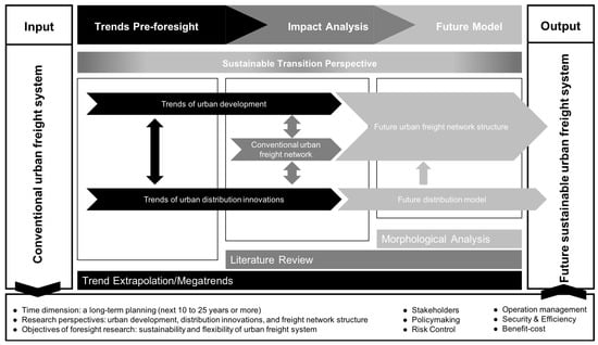 From the previous discussion, we determined that the long-term planning of sustainable urban freight transport or relevant foresight research is lacking. Additionally, the research on urban freight network design has paid scant attention to the trends of both urban development and the integrated application of distribution innovations. This result highlights the fact that considerable research has paid little attention to the long-term planning of sustainable urban logistics, as well as the impacts of these two trends for the UFT. At present, to the best of our knowledge, such studies are absent. Unmistakably, the comprehensive consideration of these two trends in the design of the urban freight network can further promote the sustainability and flexibility of the future urban freight system. To this end, this paper aims to develop a theoretical framework of foresight research on SUFT to resolve this gap. Consequently, the research questions (RQ) of this paper are presented as follows: