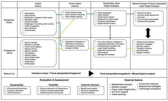 After determining possible future distribution models in city logistics, the next step is to design a flexible and sustainable urban freight network structure. Indeed, considerable research on city logistics planning has been mainly based on the conventional urban freight network structure, namely, a single-tier or two-tier system. The research perspective of these articles is also from the view of short-term planning. As mentioned previously, foresight research focuses on long-term planning. The morphological analysis method contributes to an understanding of future urban logistics. Morphological analysis contributes to the design of a flexible urban freight network structure because it is a qualitative methodology for the systematic consideration of all external factors. This finding reveals that the usage of morphological analysis is a suitable method to design the future urban freight system, particularly after understanding the megatrends of cities and freights.