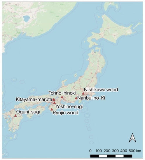 - Toho-hinoki. Available online: http://www.gifu-mokuzai.jp/tono/ (accessed on 5 March 2020).