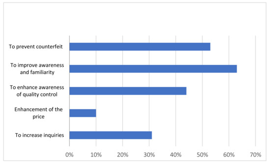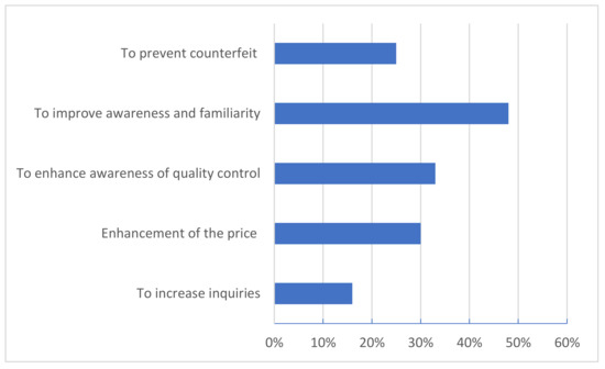 Kitayama-maruta, Kitayama-sugi, Yoshino wood, Yoshino-sugi, and Yoshino-hinoki named the “prevention of counterfeit items” as the motivation for application, whereas Nishikawa wood, Oguni-sugi, Tohno-hinoki, the Nanbu-no-ki, and Ryujin wood chose the “improvement of recognition and awareness” as the motivation for application.
